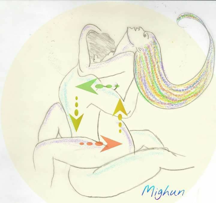 Dans de nombreux ouvrages abordant la sexualité éthérique, cette sexualité qui s’appuie sur la circulation des énergies en soi et avec son/sa partenaire, il est décrit, pour un couple hétéro, un sens de circulation.